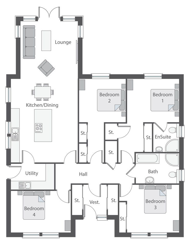 The Fern Double Garage has everything we love about the Fern but with a generous double garage too. It is an elegantly designed and expansively proportioned 4 bedroom detached bungalow giving the modern family a wonderful home where everyone can enjoy a wealth of space.